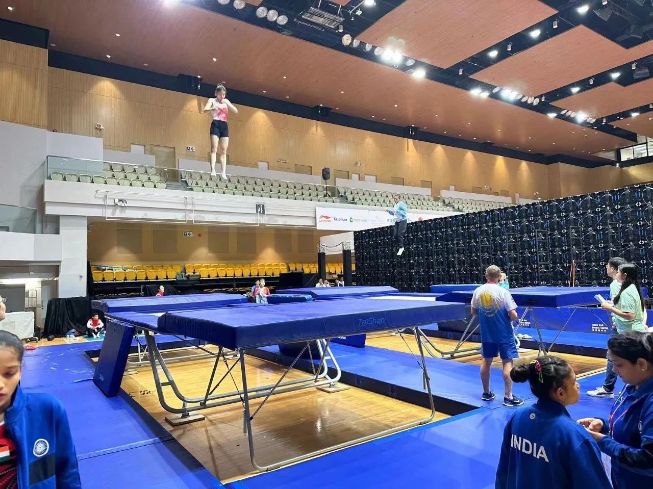 为服务好本届蹦床锦标赛,jn江南体育保障人员严格按照赛事服务手册开展工作,从场馆的规划布局、器材的安装调试、标准高度的校准、过程巡检等各个环节,一丝不苟、严谨细致,确保蹦床器材安装的准确无误,始终践行国际赛场上的中国标准,见证jn江南体育全领域规划、设计、制造、集成、运营、服务一站式解决方案的发展理念。