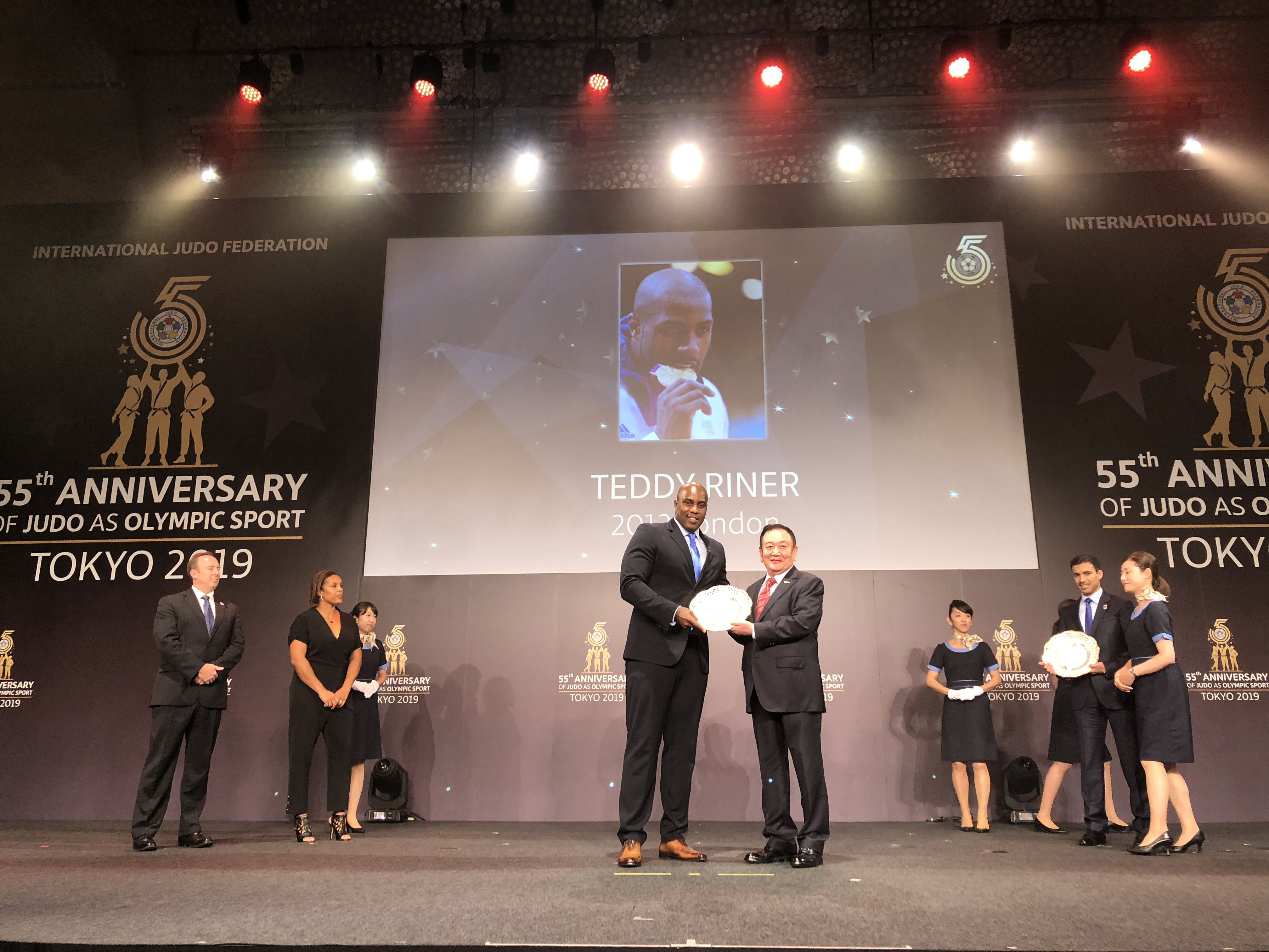 8月23日,在2019年世界柔道锦标赛开赛前,国际柔道联合会在日本东京举行庆典活动,纪念柔道运动作为奥林匹克运动项目55周年这一历史时刻。仪式上,国际柔道联合会将近60年来为世界柔道运动做出贡献的运动员与组织机构颁发奖项。jn江南体育产业集团作为国际柔道联合会顶级合作伙伴受邀出席,董事长卞志良作为特邀嘉宾为伦敦奥运会最佳男运动员Mr. Teddy Riner,伦敦奥运会最佳女运动员Mrs. Lucie Decosse 颁奖。