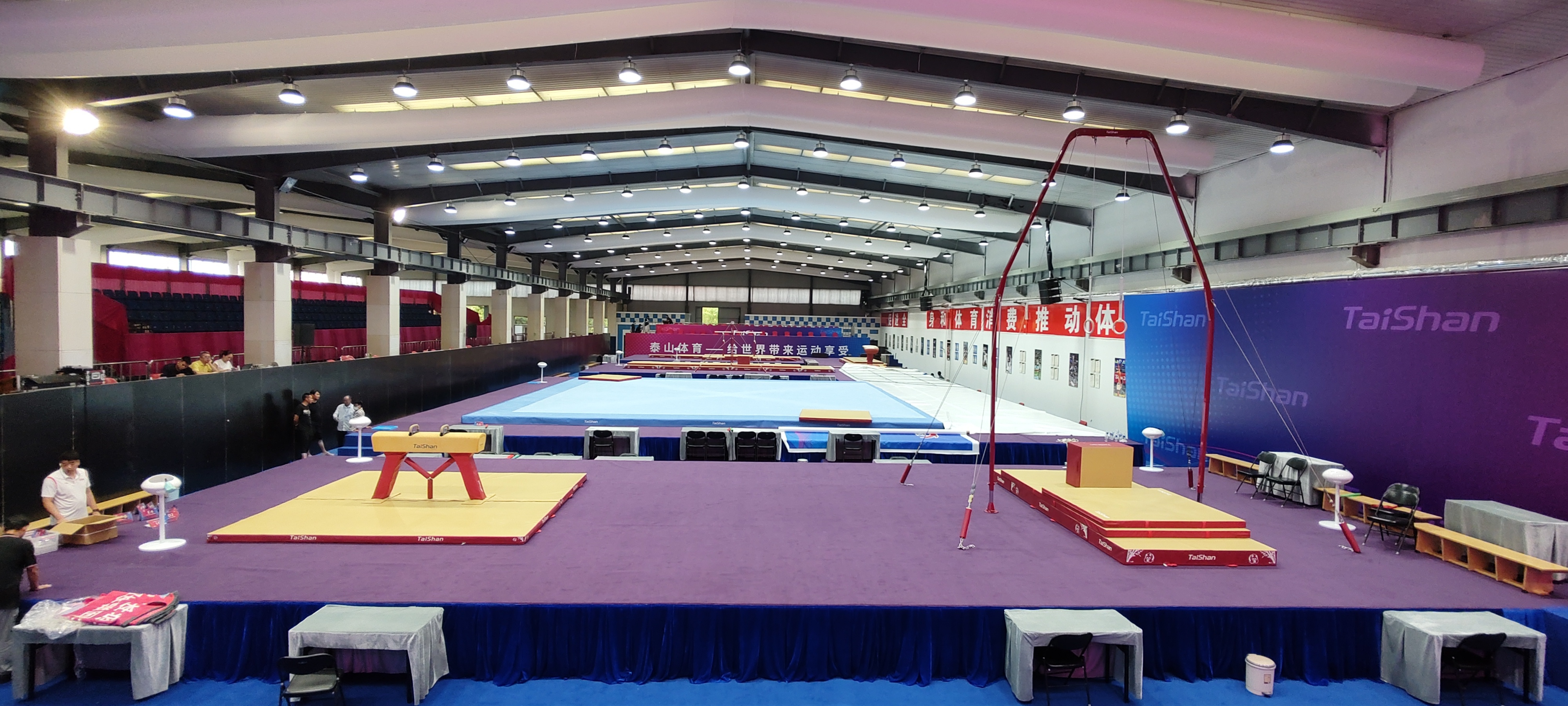 目前,在场馆与场地器材保障部的全力工作之下,训练馆、比赛馆场地搭建等赛前准备工作也按计划顺利开展中,训练馆已经搭建完毕、焕然一新,即将投入到运动员们的训练任务中!